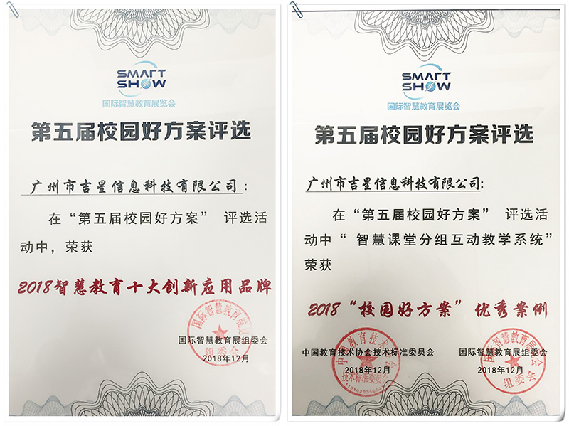 吉星榮獲年度“2018校園好方案”優秀案例與“2018智慧教育十大創新應用品牌”
