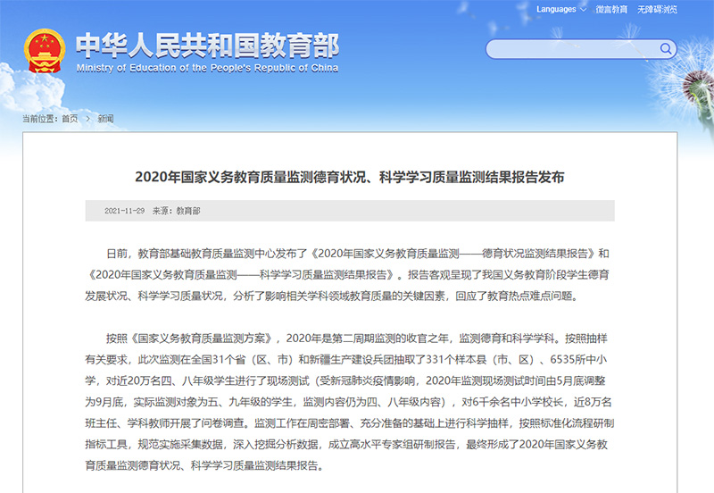 日前,教育部基礎教育質量監測中心發布了《2020年國家義務教育質量監測——德育狀況監測結果報告》和《2020年國家義務教育質量監測——科學學習質量監測結果報告》。